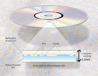 Trong quá trình sản xuất, loại nhựa này gây ấn tượng với những va chạm cực nhỏ được sắp xếp như một đường dữ liệu xoắn ốc duy nhất, liên tục, cực dài. Khi miếng polycarbonate trong suốt được hình thành, một lớp nhôm mỏng, phản chiếu được phủ lên đĩa, che đi các vết lõm lồi. Sau đó, một lớp acrylic mỏng được phun lên trên nhôm để bảo vệ nó. Nhãn sau đó được in lên acrylic. Mặt cắt ngang của một đĩa CD hoàn chỉnh (không chia tỷ lệ) trông như hình trên.