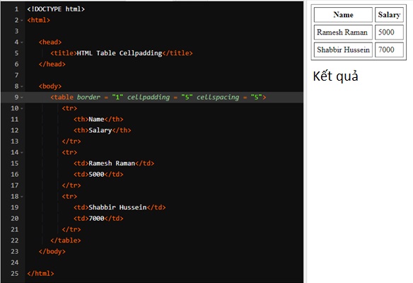 Có hai thuộc tính được gọi là cellpadding và cellspacing mà bạn sẽ sử dụng để điều chỉnh khoảng trắng trong các ô bảng của mình. Thuộc tính cellspacing xác định khoảng cách giữa các ô trong bảng, trong khi cellpadding biểu thị khoảng cách giữa các đường viền ô và nội dung trong một ô.