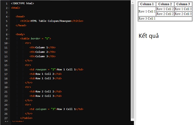 Bạn sẽ sử dụng thuộc tính colspan nếu bạn muốn hợp nhất hai hoặc nhiều cột thành một cột duy nhất. Cách tương tự, bạn sẽ sử dụng rowspan nếu bạn muốn hợp nhất hai hoặc nhiều hàng.