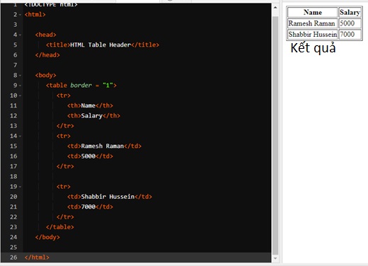 Tiêu đề bảng có thể được xác định bằng thẻ <th> . Thẻ này sẽ được đặt để thay thế thẻ <td>, được sử dụng để đại diện cho ô dữ liệu thực tế. Thông thường, bạn sẽ đặt hàng trên cùng của mình làm tiêu đề bảng như hình dưới đây, nếu không, bạn có thể sử dụng phần tử <th> trong bất kỳ hàng nào. Các tiêu đề được xác định trong thẻ <th> được căn giữa và in đậm theo mặc định.