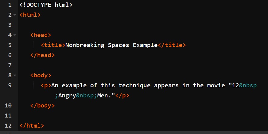 Trong trường hợp bạn không muốn trình duyệt máy khách ngắt văn bản, bạn nên sử dụng thực thể dấu cách không ngắt & nbsp; thay vì một không gian bình thường. Ví dụ: khi viết mã “12 Angry Men” trong một đoạn văn, bạn nên sử dụng tương tự như đoạn mã sau: