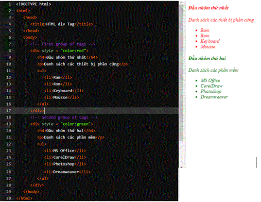 Thẻ div được gọi là thẻ Division, mỗi thẻ trong HTML đều có mục đích khác nhau. Ví dụ như thẻ <p> được dùng để chỉ định một đoạn văn bản nhất định. Thẻ div được sử dụng trong HTML để phân chia nội dung trong trang web như (văn bản, hình ảnh, đầu trang, chân trang, thanh điều hướng, v.v.). Thẻ Div có cả thẻ mở (<div>) và đóng (</div>) và bắt buộc phải đóng thẻ. Div là thẻ có thể sử dụng nhiều nhất trong phát triển web vì nó giúp chúng ta tách dữ liệu trong trang web và chúng ta có thể tạo một phần cụ thể cho dữ liệu hoặc chức năng cụ thể trong các trang web.